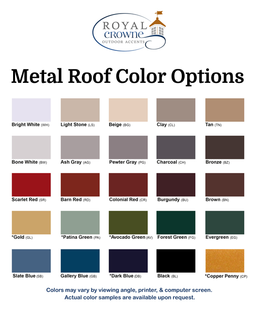 - Metal Roof Color – Base Option is Black; Other colors are available, please see product images for color options.