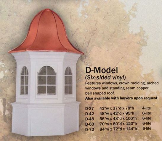 The K-Model Cupola is six sided and features arched windows, crown molding and a bell shaped standing seam copper roof (a metal roof option is available). It is available in multiple sizes, select your size below. If your roof pitch is greater than 10/12, Call Us directly to order.
