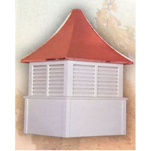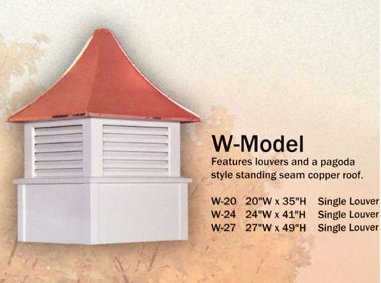 The W-Model Cupola features louvers and a pagoda style standing seam copper roof (a metal roof option is available). It is available in multiple sizes, the smaller sizes feature single louver sides and the larger sizes feature double louvers. If your roof pitch is greater than 10/12, Call Us directly to order.