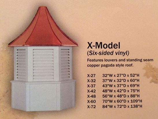 The X-Model Cupola is six sided and features louvers and a pagoda style standing seam copper roof (a metal roof option is available). It is available in multiple sizes, select your size below. If your roof pitch is greater than 10/12, Call Us directly to order.