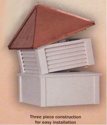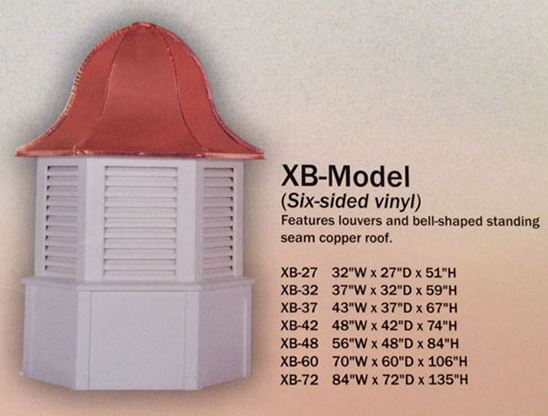 The XB-Model Cupola is six sided and features louvers and a bell shaped standing seam copper roof (a metal roof option is available). It is available in multiple sizes, select your size below. If your roof pitch is greater than 10/12, Call Us directly to order.